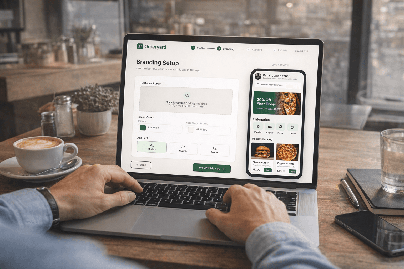 In the same portal, you upload your own logo, choose your colors, and add your photos so your app and website look like your restaurant from day one.