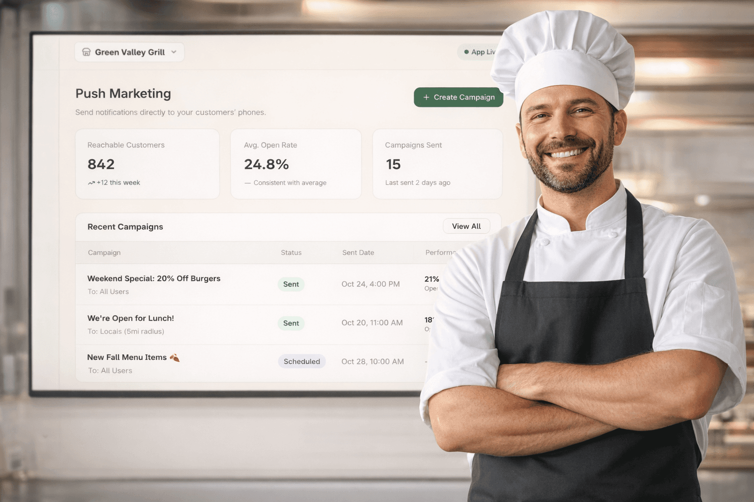 Once you're happy, you flip ordering on. From your portal you can send push notifications, emails, and texts to bring customers back without paying marketplace fees.